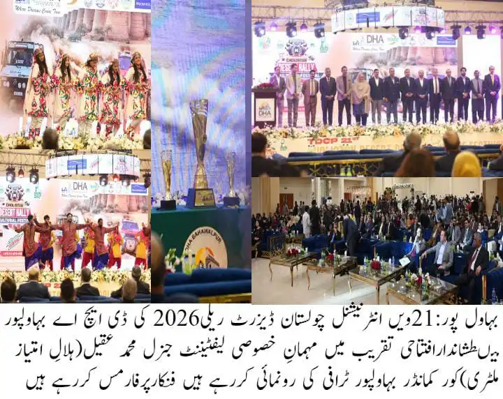 بہاول پور(ملک طارق) ڈی ایچ اے بہاولپور میں آج حکومتِ پنجاب اور ٹورازم ڈویلپمنٹ کارپوریشن آف پنجاب کی جانب سے منعقد ہونے والی 21ویں انٹرنیشنل چولستان ڈیزرٹ ریلی 2026 کی افتتاحی تقریب شاندار انداز میں منعقد ہوئی۔ تقریب کے مہمانِ خصوصی لیفٹیننٹ جنرل محمد عقیل، ہلالِ امتیاز (ملٹری)، کور کمانڈر بہاولپور تھے۔ ایونٹ کا باقاعدہ افتتاح کمشنر بہاولپور ڈویژن محترمہ مسرت جبین اور پراجیکٹ ڈائریکٹر ڈی ایچ اے بہاولپور بریگیڈیئر خرم شہزاد باجوہ نے مشترکہ طور پر کیا۔