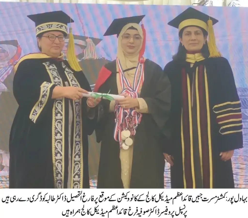 بہاول پور:قائد اعظم میڈیکل کالج بہاولپور کا آٹھواں کانووکیشن منعقد ہوا جس میں 1500 سے زائد گریجویٹ ڈاکٹرز کو ان کی تعلیمی کامیابیوں کے اعتراف میں ڈگریاں اور نمایاں کارکردگی پر میڈلز عطا کیے گئے۔تقریب کی مہمانِ خصوصی کمشنر بہاولپور ڈویژن مسرت جبیں تھیں، جبکہ کالج کی پرنسپل پروفیسر ڈاکٹر صوفیہ فرخ نے بھی اس موقع پر خصوصی شرکت کی۔
