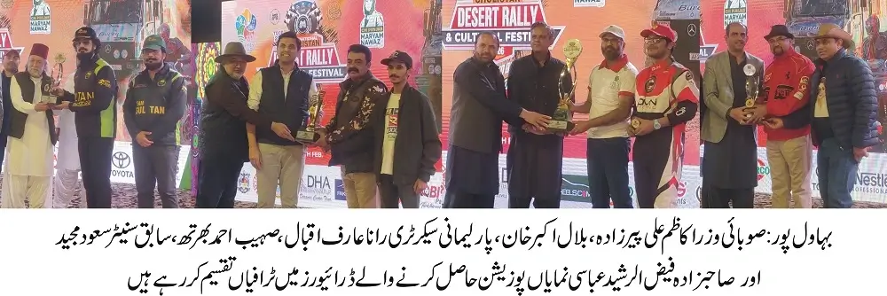 بہاول پور: 21 ویں ٹی ڈی سی پی انٹرنیشنل چولستان ڈیزرٹ ریلی کی تقریبِ تقسیمِ انعامات ٹی ڈی سی پی ریزورٹ دراوڑ میں شاندار انداز میں منعقد ہوئی۔ تقریب میں سینئر صوبائی وزیر مریم اورنگزیب نے بطور مہمانِ خصوصی شرکت کی جبکہ صوبائی وزرا کاظم علی پیرزادہ، صہیب احمد بھرتھ، بلال اکبر خان اور پارلیمانی سیکرٹریز رانا عارف اقبال، صاحبزادہ گزین عباسی بھی ان کے ہمراہ تھے۔ کامیاب ڈرائیورز میں ٹرافیاں اور انعامات تقسیم کیے گئے۔